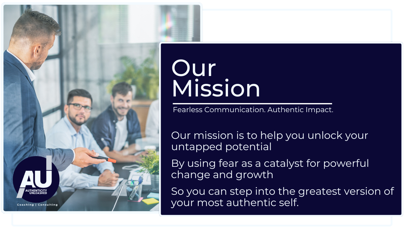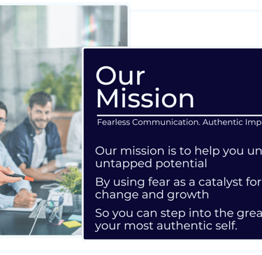 Fearless Communication. Authentic Impact. Our mission is to help you unlock your untapped potential By using fear as a catalyst for powerful change and growth So you can step into the greatest version of your most authentic self.
