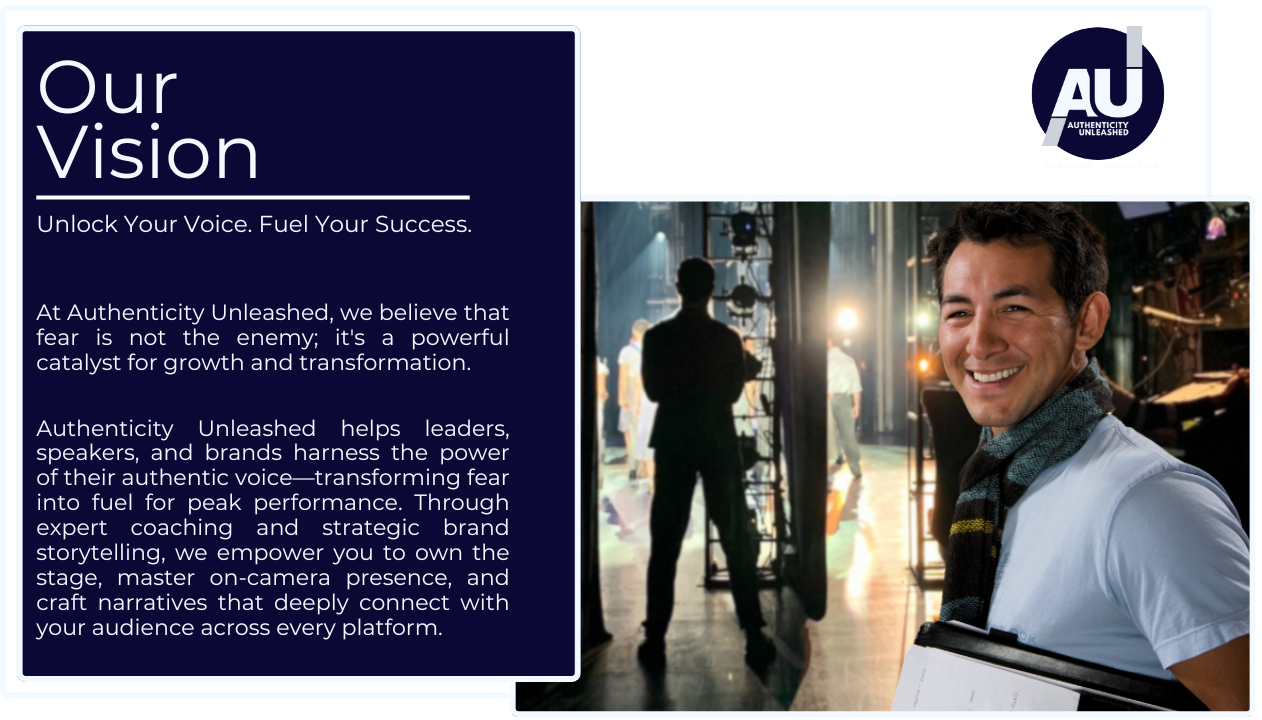 At Authenticity Unleashed, we believe that fear is not the enemy; it's a powerful catalyst for growth and transformation. Whether you're battling stage fright, seeking on-camera confidence, or struggling to craft a brand narrative that truly resonates, Authenticity Unleashed empowers you to transform fear into your greatest strength. Authenticity Unleashed helps leaders, speakers, and brands harness the power of their authentic voice—transforming fear into fuel for peak performance. Through expert coaching and strategic brand storytelling, we empower you to own the stage, master on-camera presence, and craft narratives that deeply connect with your audience across every platform